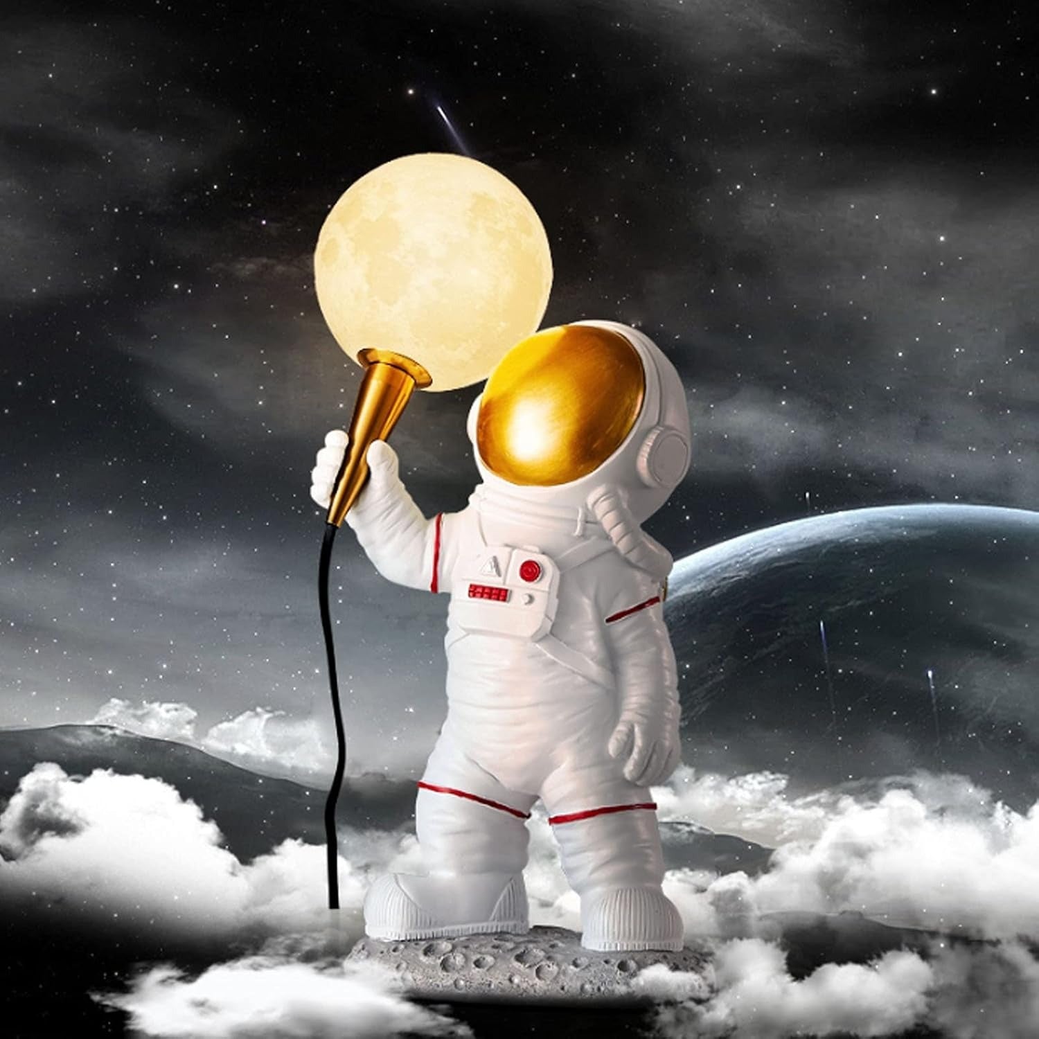 Élevez votre décoration sur le thème de l'espace avec cette lampe de table captivante LED moderne, représentant un astronaute suspendu dans les airs.